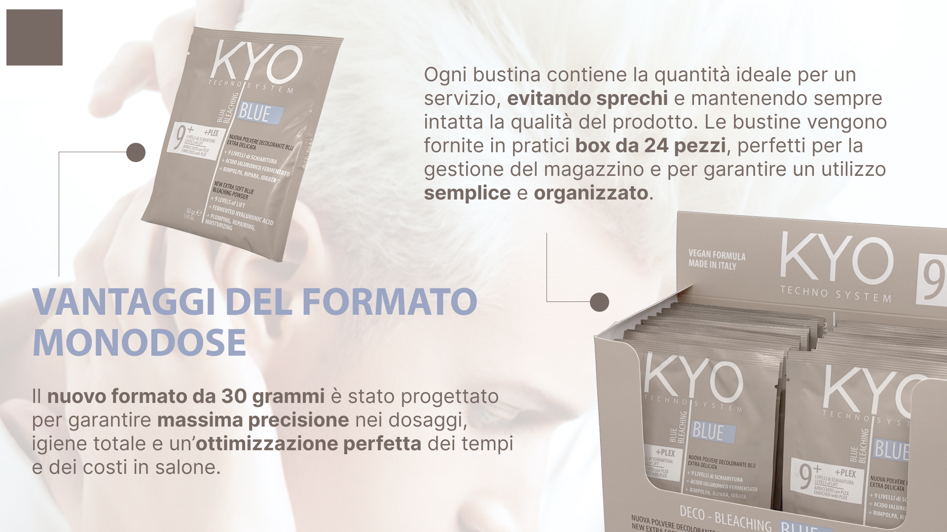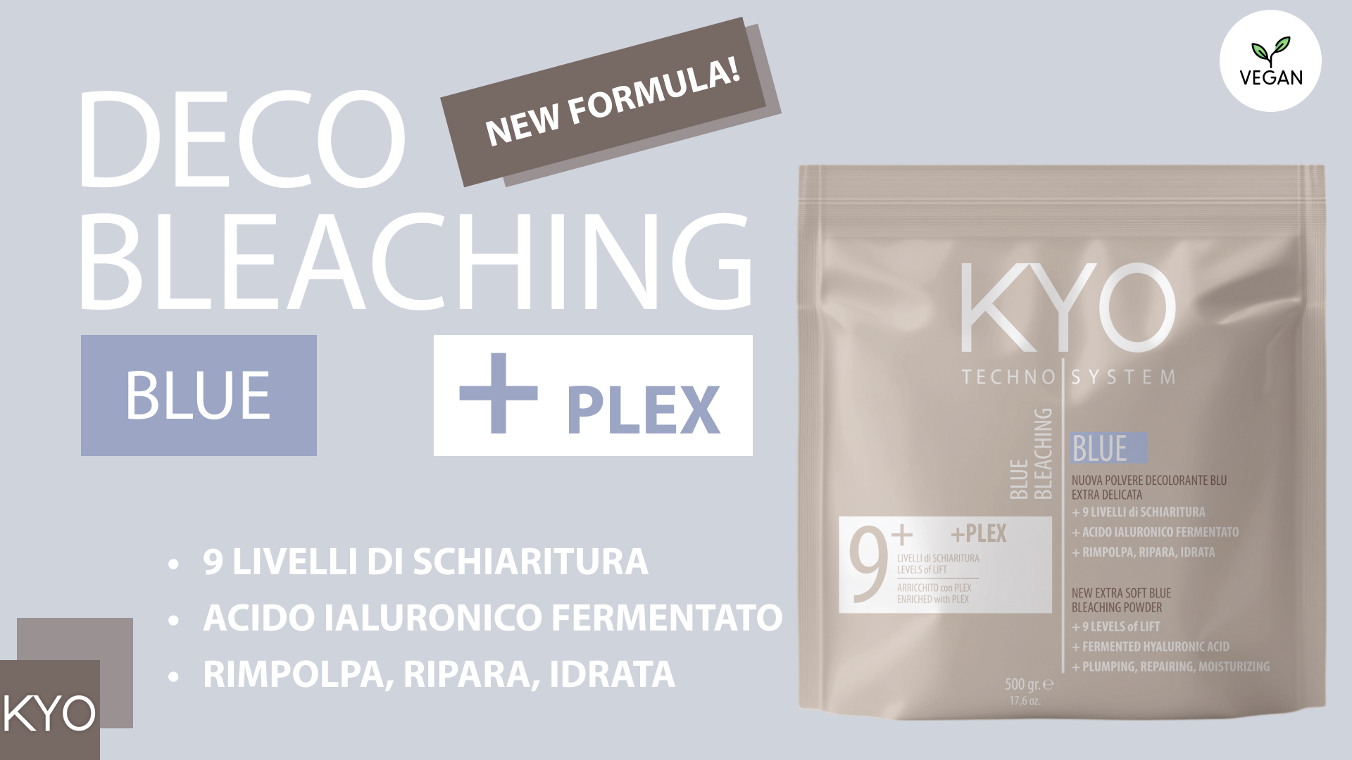 La nuova formulazione KYO è stata studiata per offrire un’azione rimpolpante grazie alla presenza di ingredienti puri, micro-granuli compatti e una texture non volatile. Schiarisce fino a 9 livelli, garantendo risultati professionali su tutte le tecniche di decolorazione. L’azione è potenziata da una formula completamente vegana e arricchita con acido ialuronico fermentato, che protegge e tratta il capello durante il servizio tecnico.